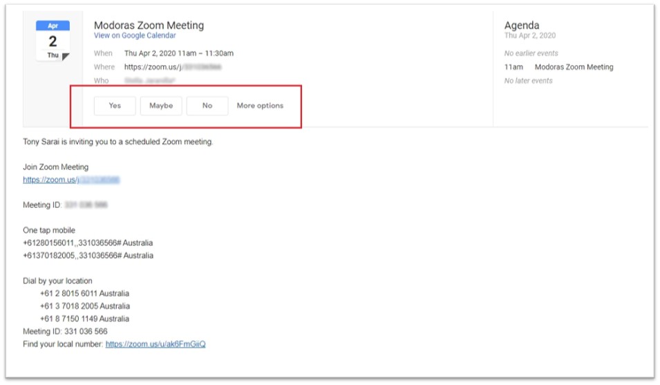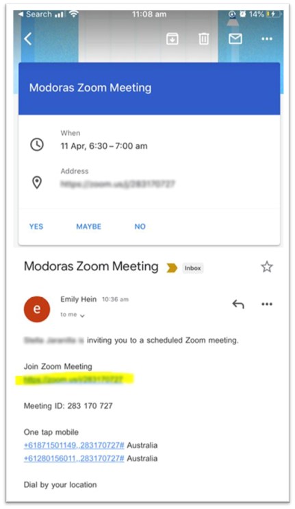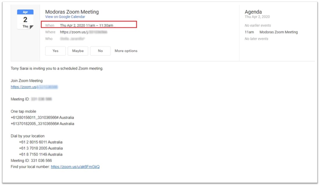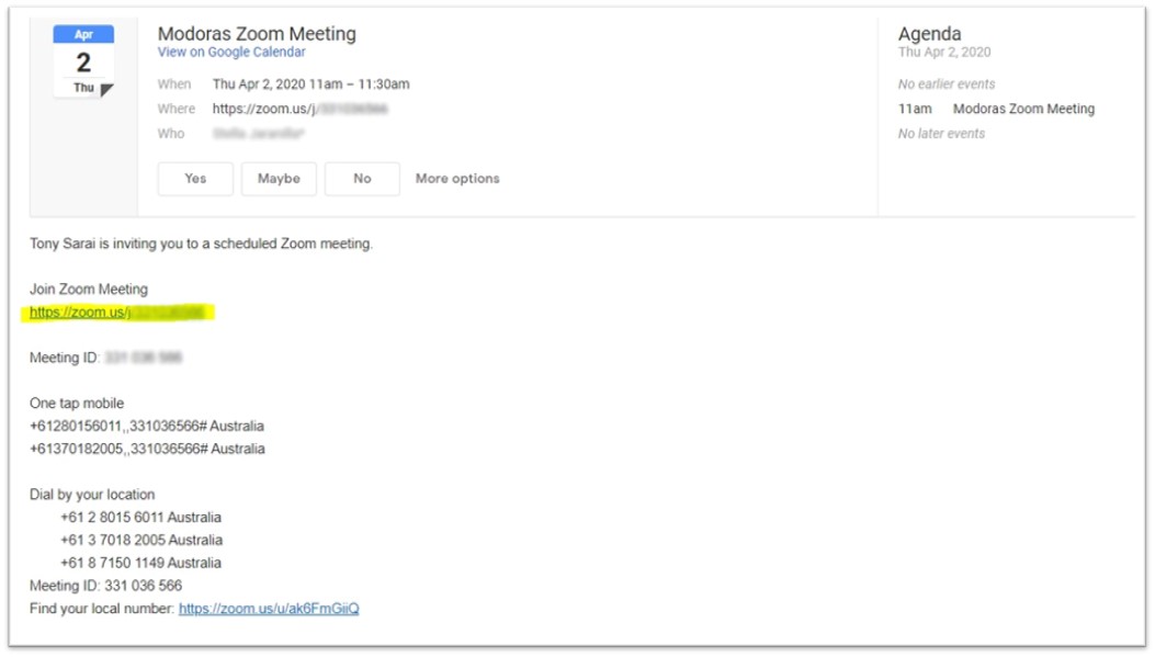 Your Modoras Zoom meeting invitation includes the following:
