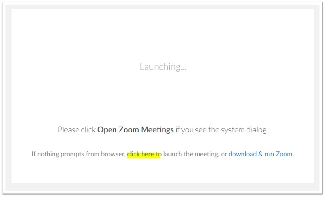 - This will take you to a Zoom website on your internet browser. Click ‘click here’ to launch the meeting.